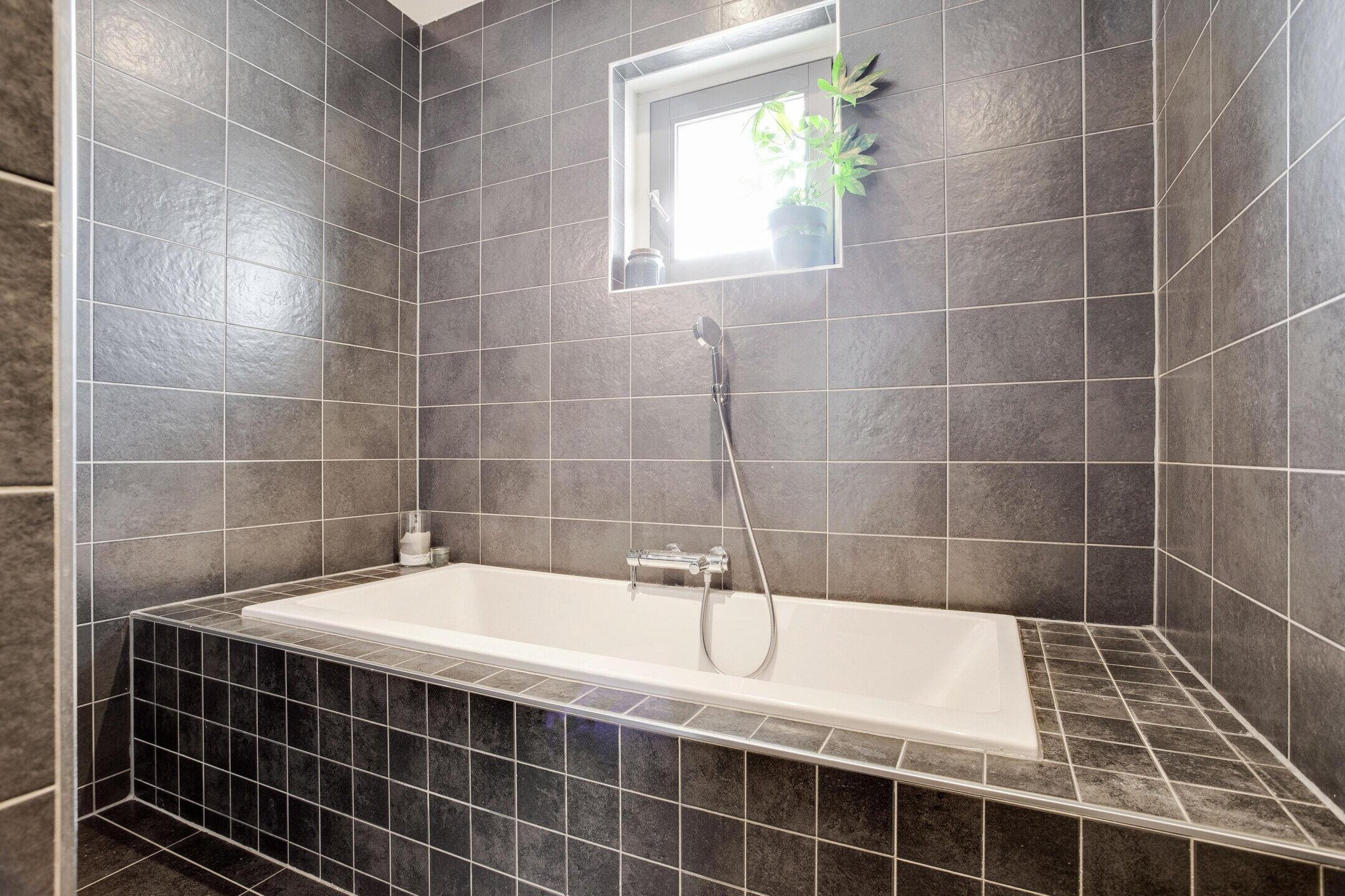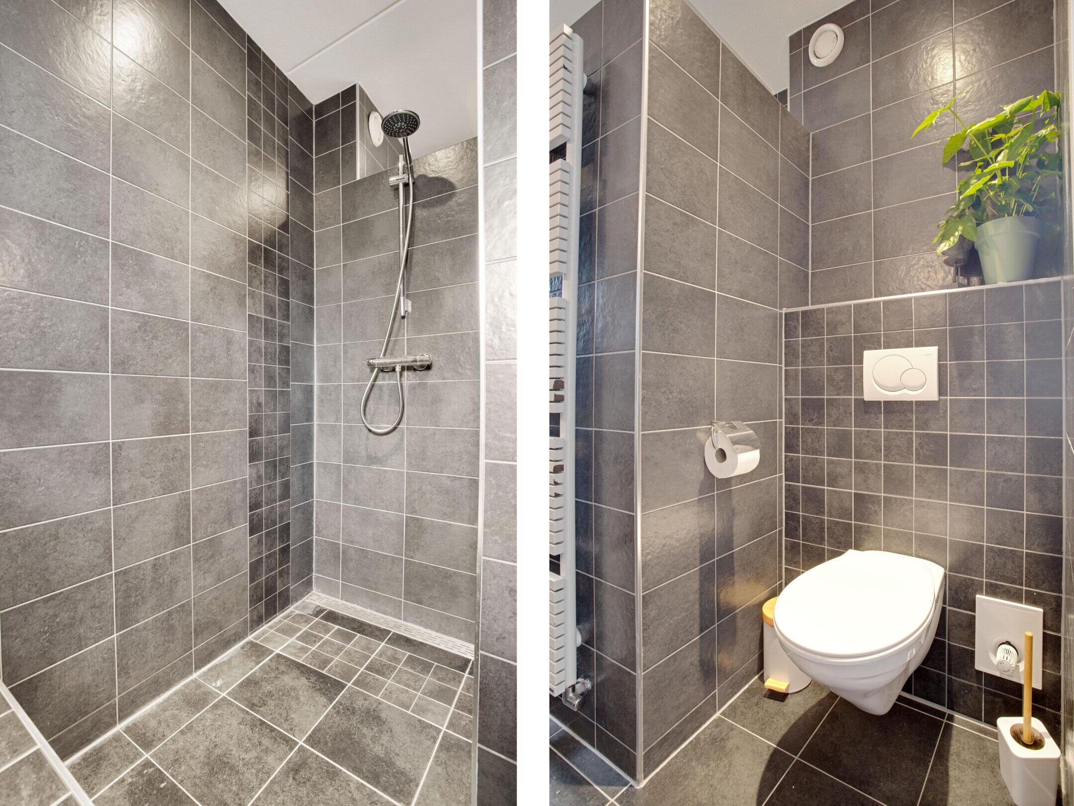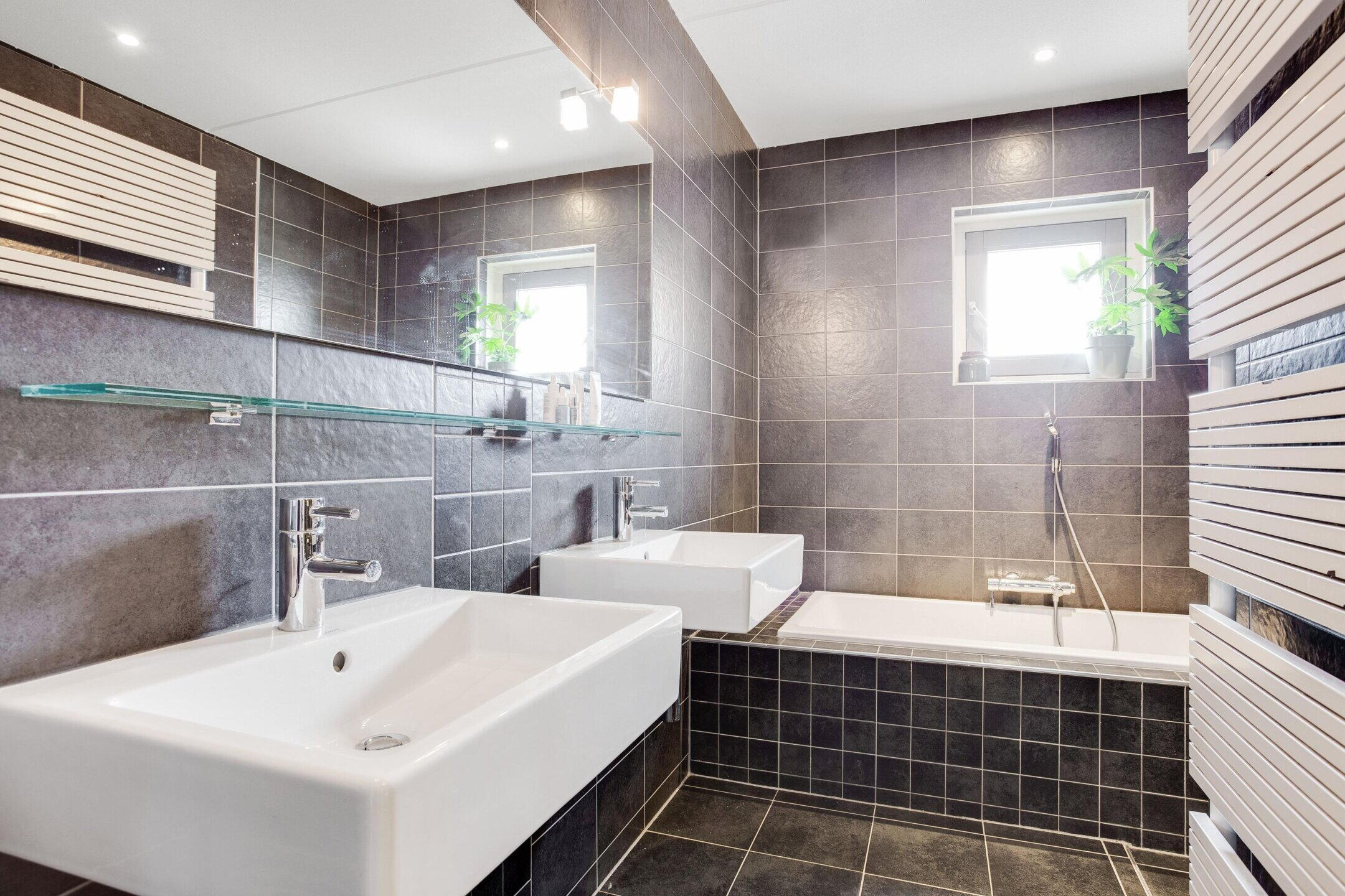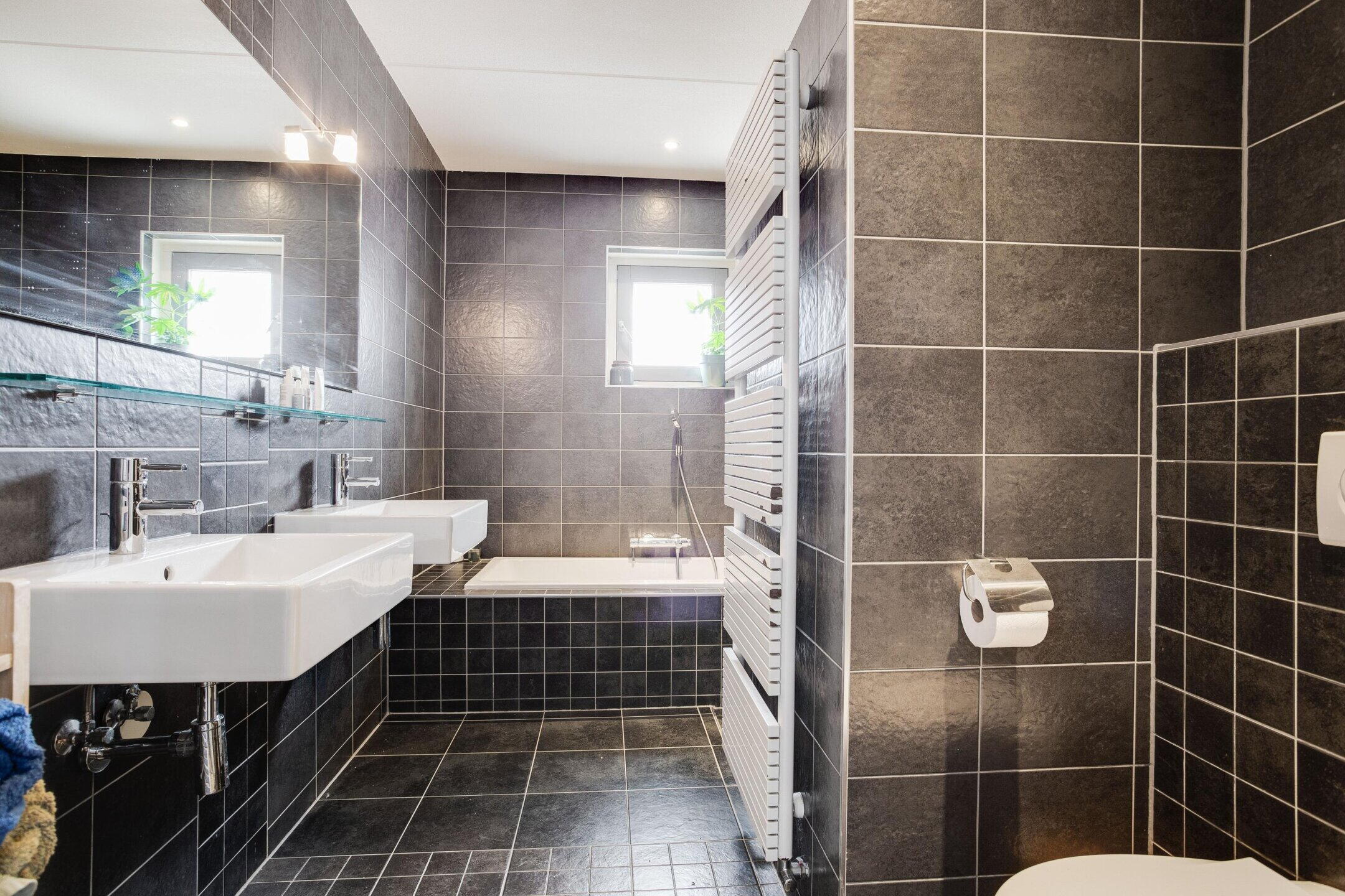 - Ligbad, toilet, dubbele wastafel, inloopdouche, vloerverwarming