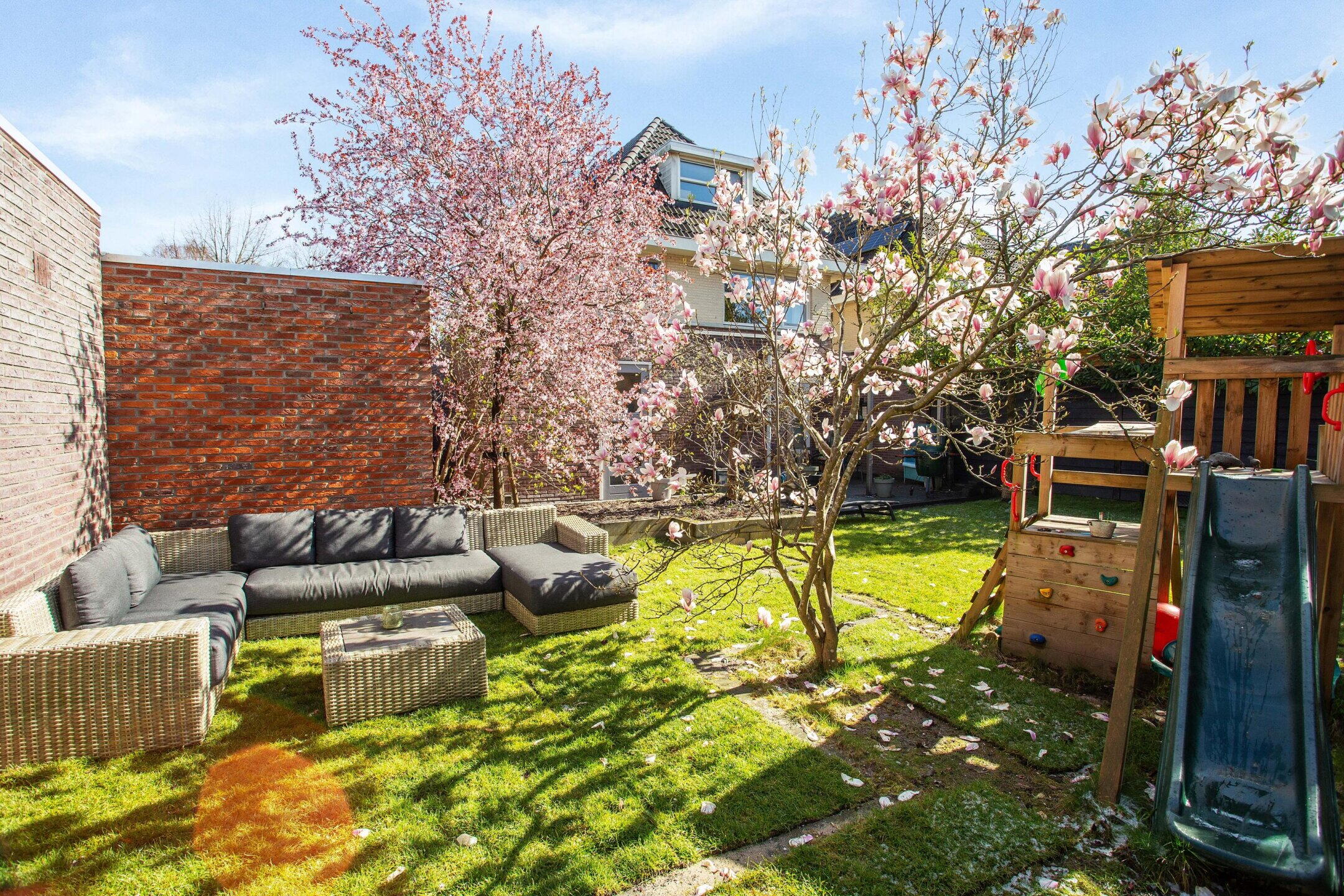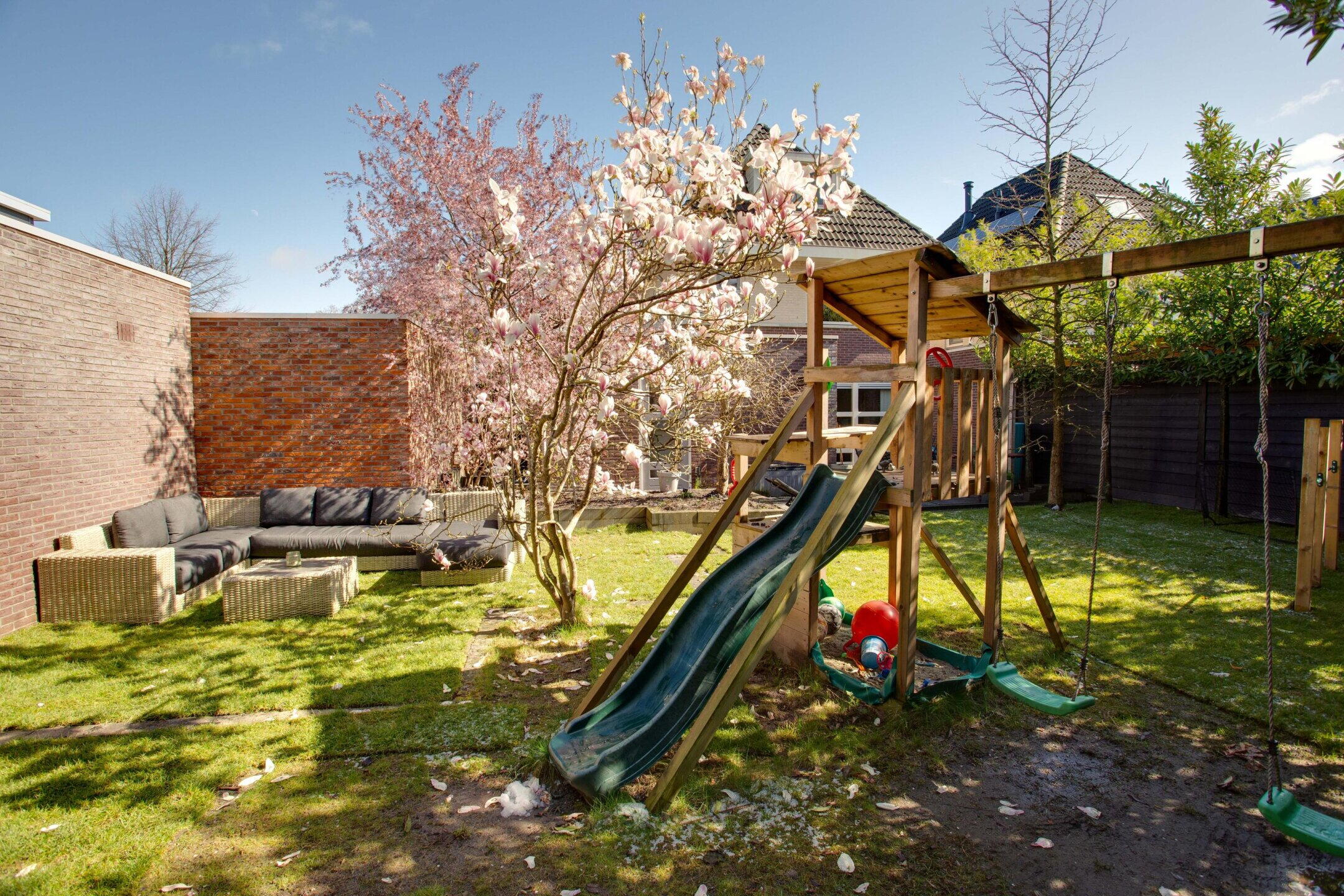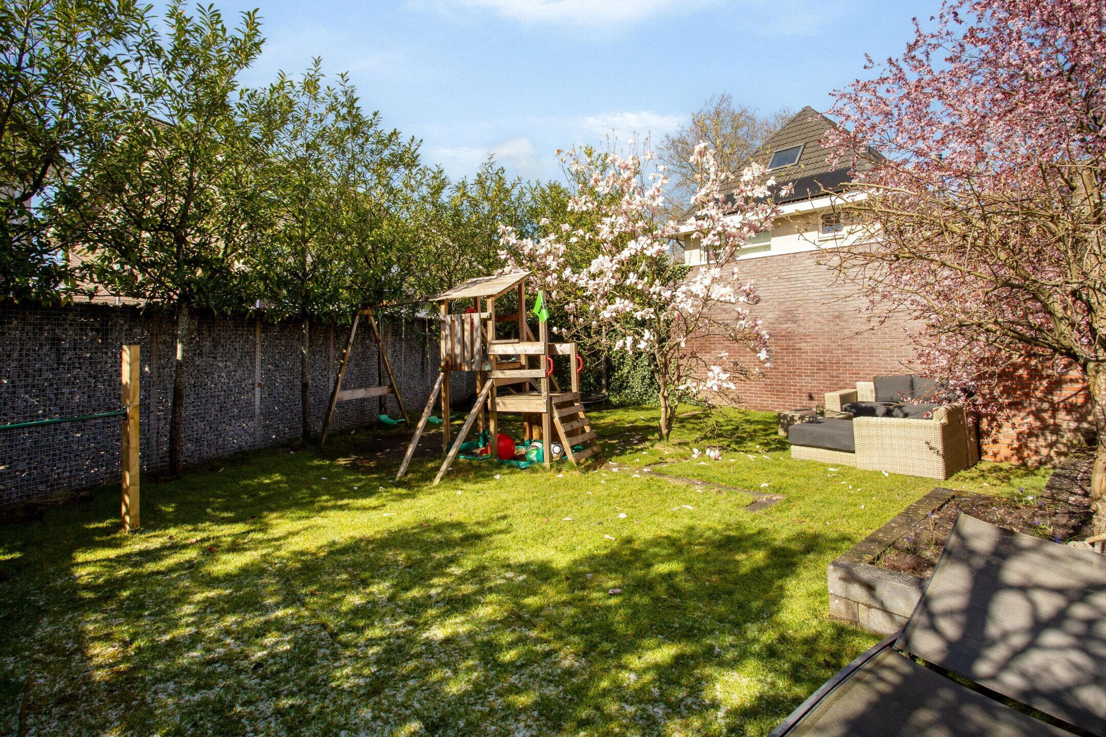 De tuin is omsloten met een groene erfafscheiding die het hele jaar door groen blijft, wat zorgt voor optimale privacy en een beschut, rustig gevoel. Een ideale plek waar kinderen veilig kunnen spelen, voetballen op het gras, klimmen op de speeltoestellen en vrij bewegen en dat terwijl ouders ontspannen kunnen genieten.
